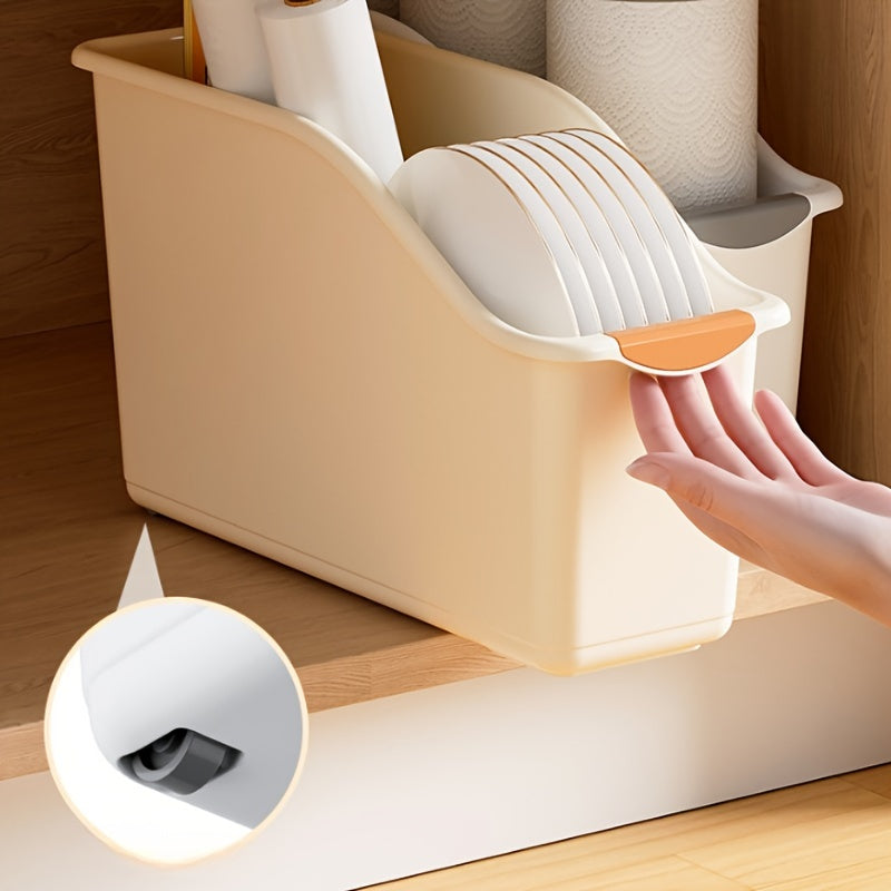 Conjunto de 2 caixas de armazenamento multifuncionais de plástico, design curvo adequado para organização doméstica, ideal para produtos de limpeza e itens essenciais domésticos, caixas de armazenamento, cestos, recipientes para organização doméstica