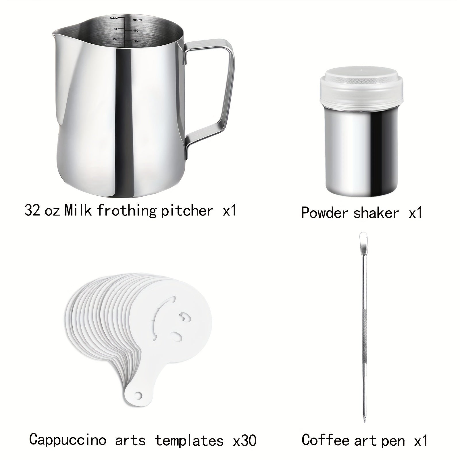 Conjunto de jarra de aço inoxidável para espumar leite de 32 oz (900 ml) com marcações de medida internas, inclui caneta para arte latte, agitador de pó e 30 moldes para arte cappuccino - Design de bico anti-gotejamento para máquinas de café expresso e espumadores de leite - Conjunto de 33 peças