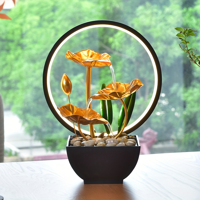 Fonte de mesa alimentada por USB, decoração em cascata de metal com anel de LED, decoração relaxante para escritório e quarto, pedras naturais incluídas, presente ideal para familiares, amigos e pais