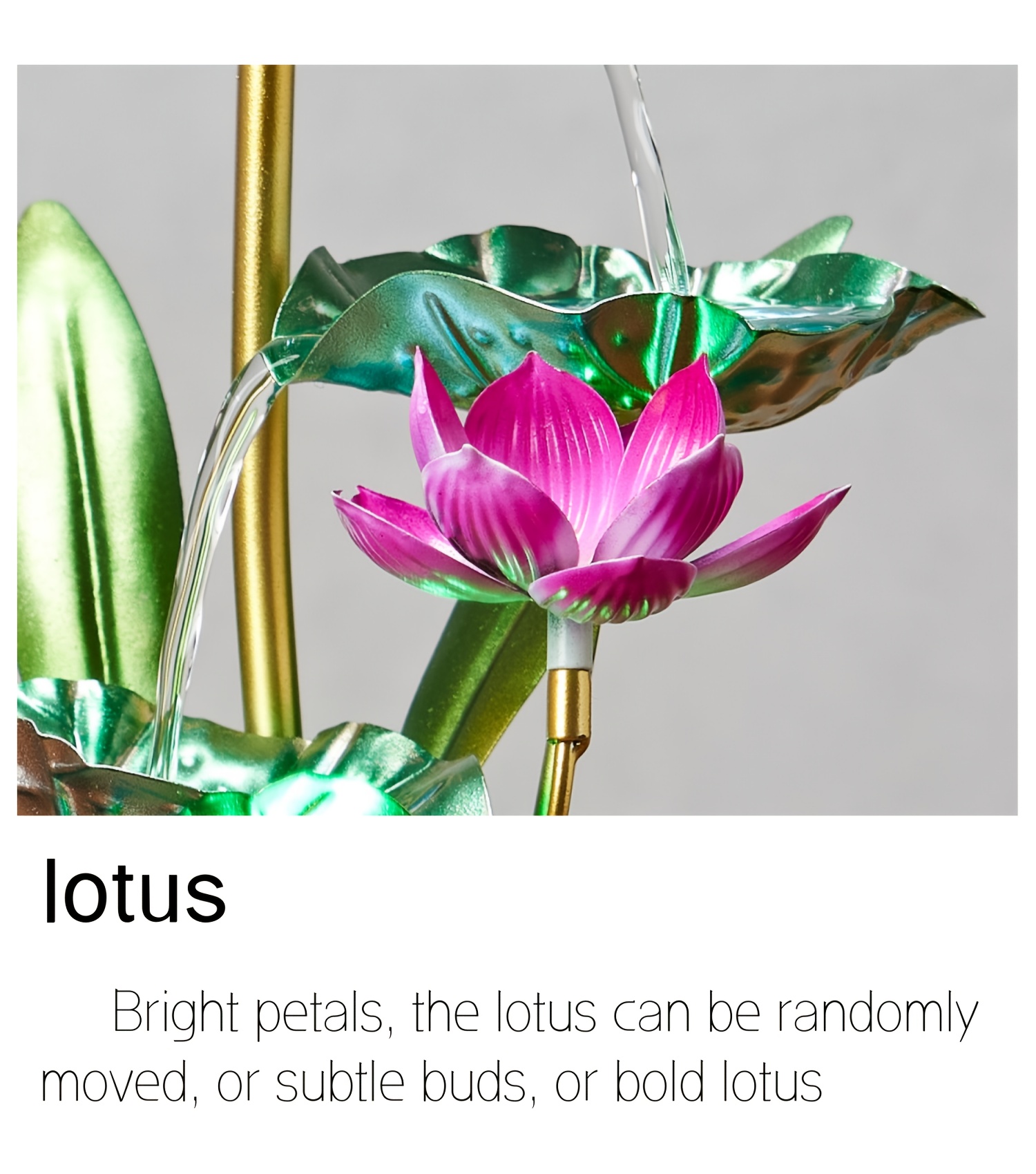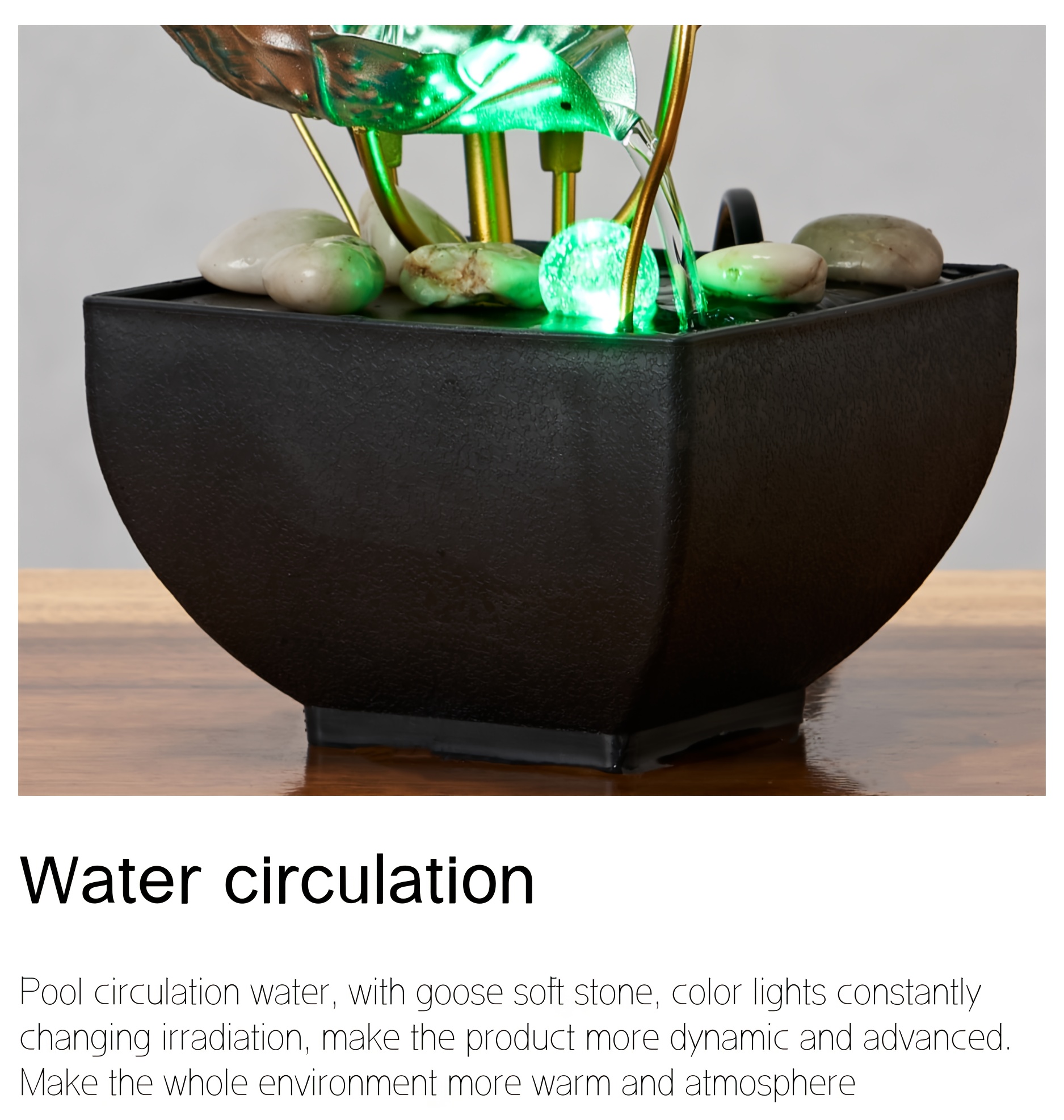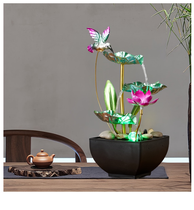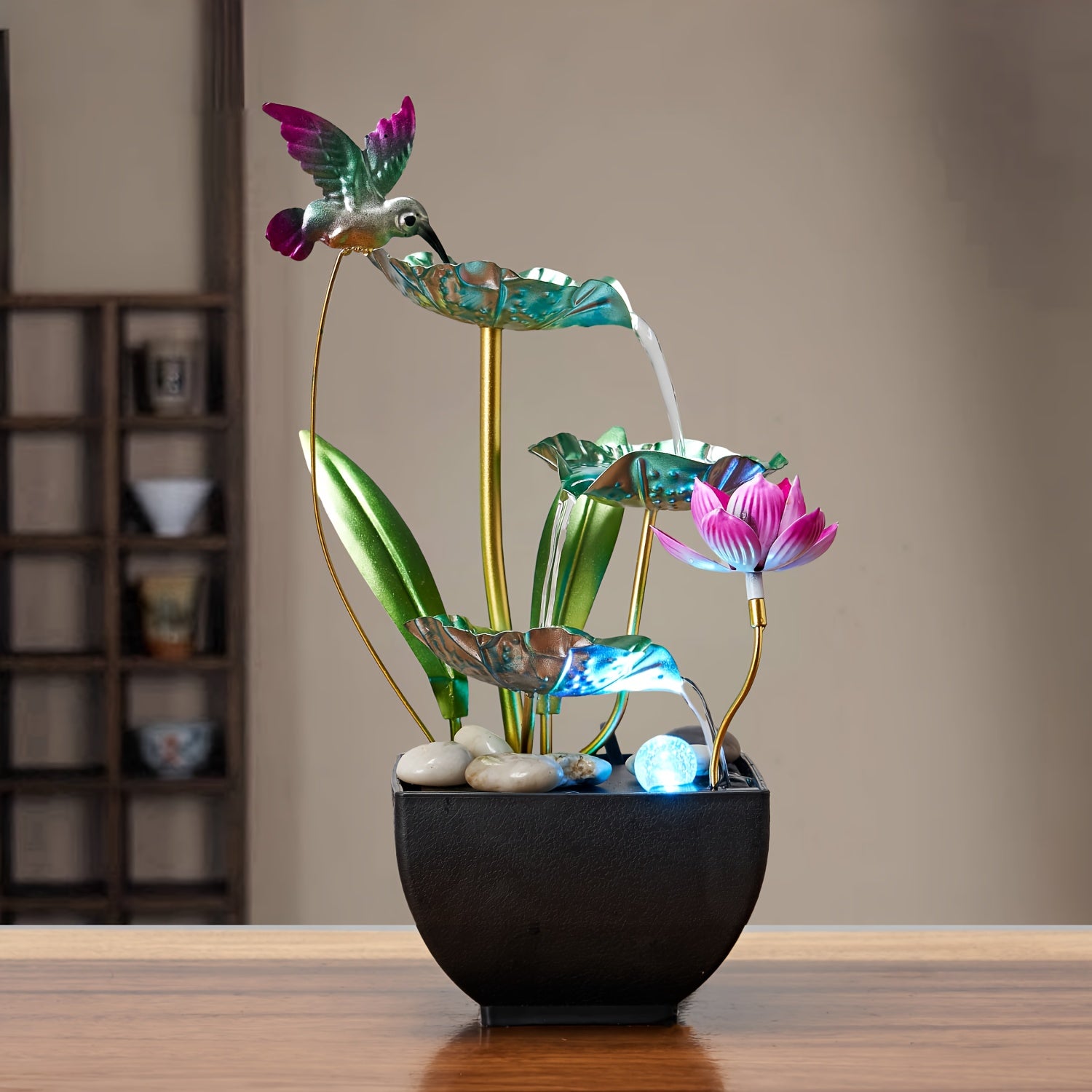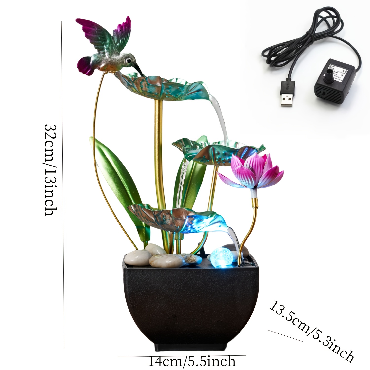 Fonte em forma de cascata em formato de beija-flor de 3 níveis com sons relaxantes, decoração de mesa de metal com alimentação USB para relaxamento, folhas verdes e rosa para design de lótus, perfeita para sala de estar ou escritório, destaque para sala de estar | Cascata decorativa | Fonte de água iluminada