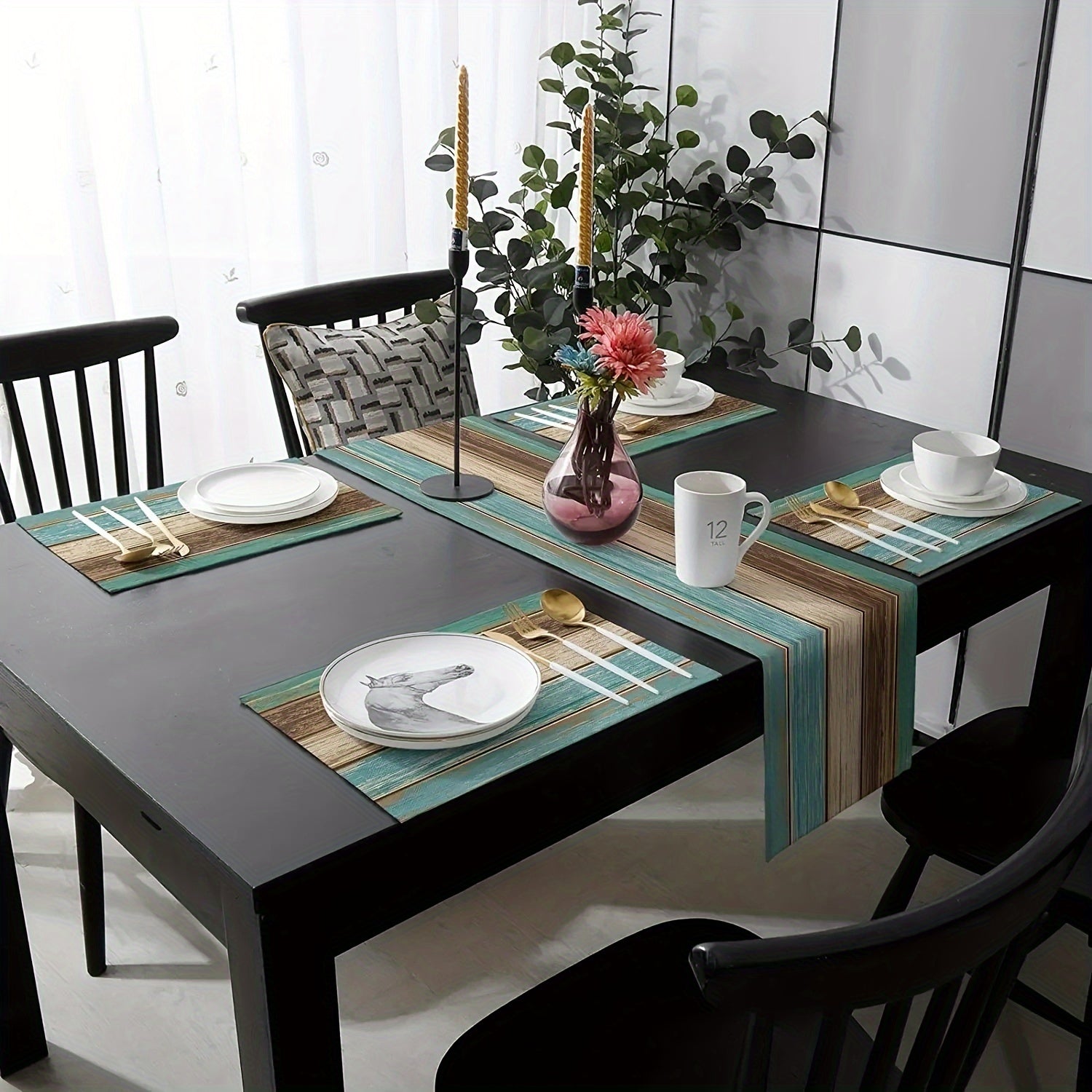 1 peça 182,88 cm * 33,02 cm 199,9 cm * 33,02 cm 4 peças 32,0 cm * 41,91 cm jogo americano com textura de madeira de fazenda, conjunto combinado de jogos americanos para festa de casamento, evento, mesa de jantar, decoração de hotel, casa, toalha de mesa