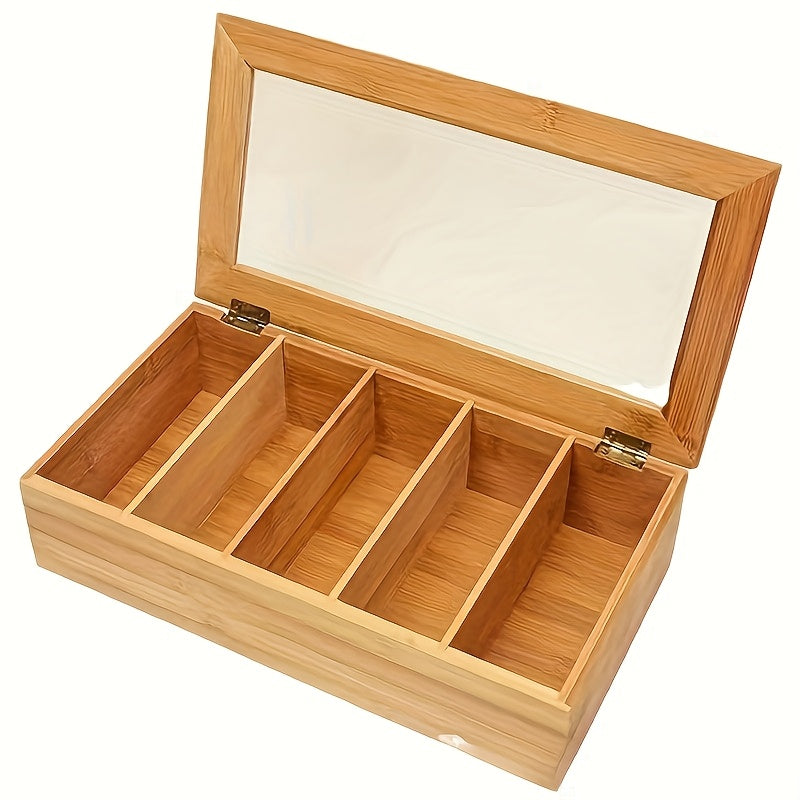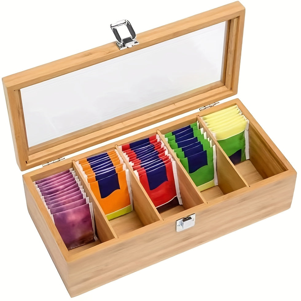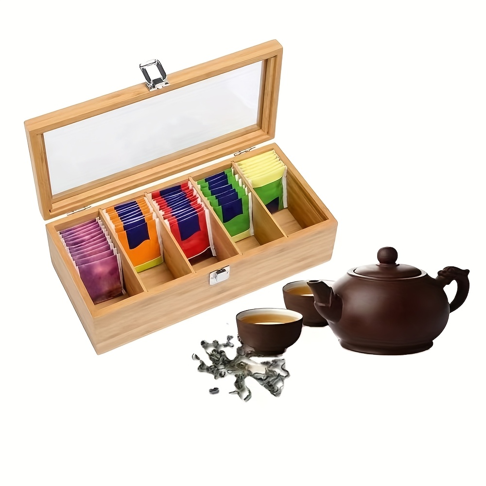 Organizador de saquinhos de chá de bambu com tampa de vidro transparente - Caixa de armazenamento com vários compartimentos para chá, café e utensílios de mesa, acabamento em madeira natural, display colorido para saquinhos de chá, perfeito para organização de cozinha ou escritório, armazenamento de chá, cestos de prateleira