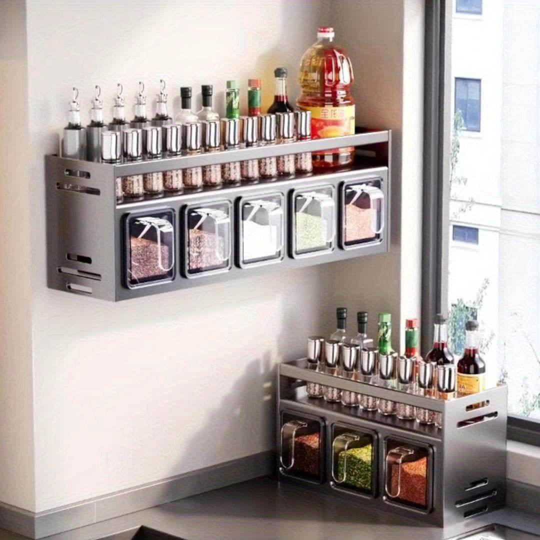 Organizador de temperos de aço inoxidável para montagem em parede com prateleiras suspensas e potes de temperos - Conjunto de armazenamento de cozinha multifuncional