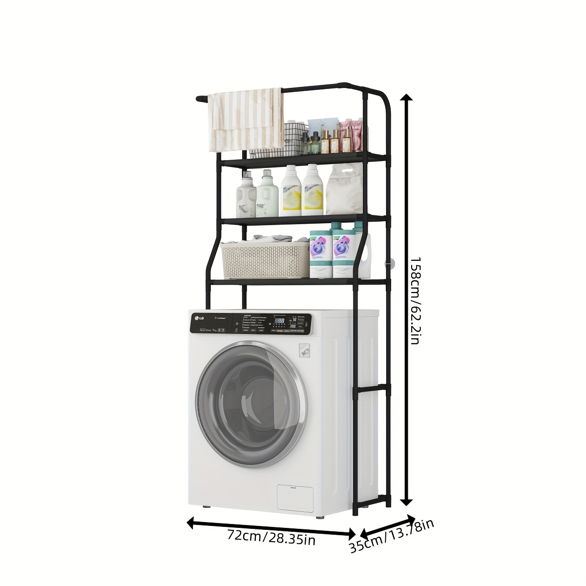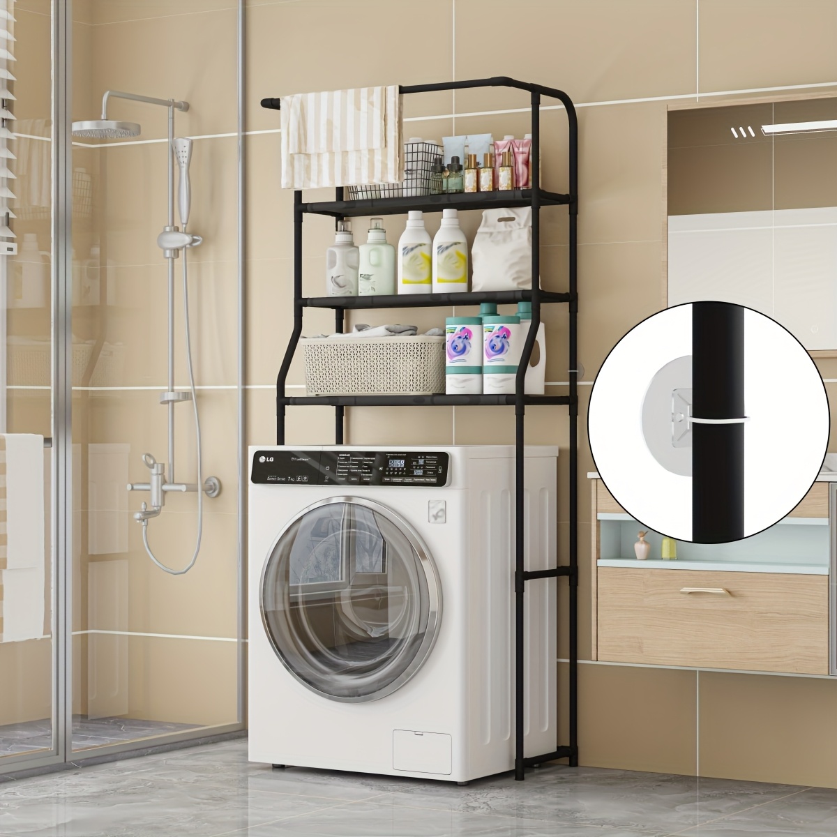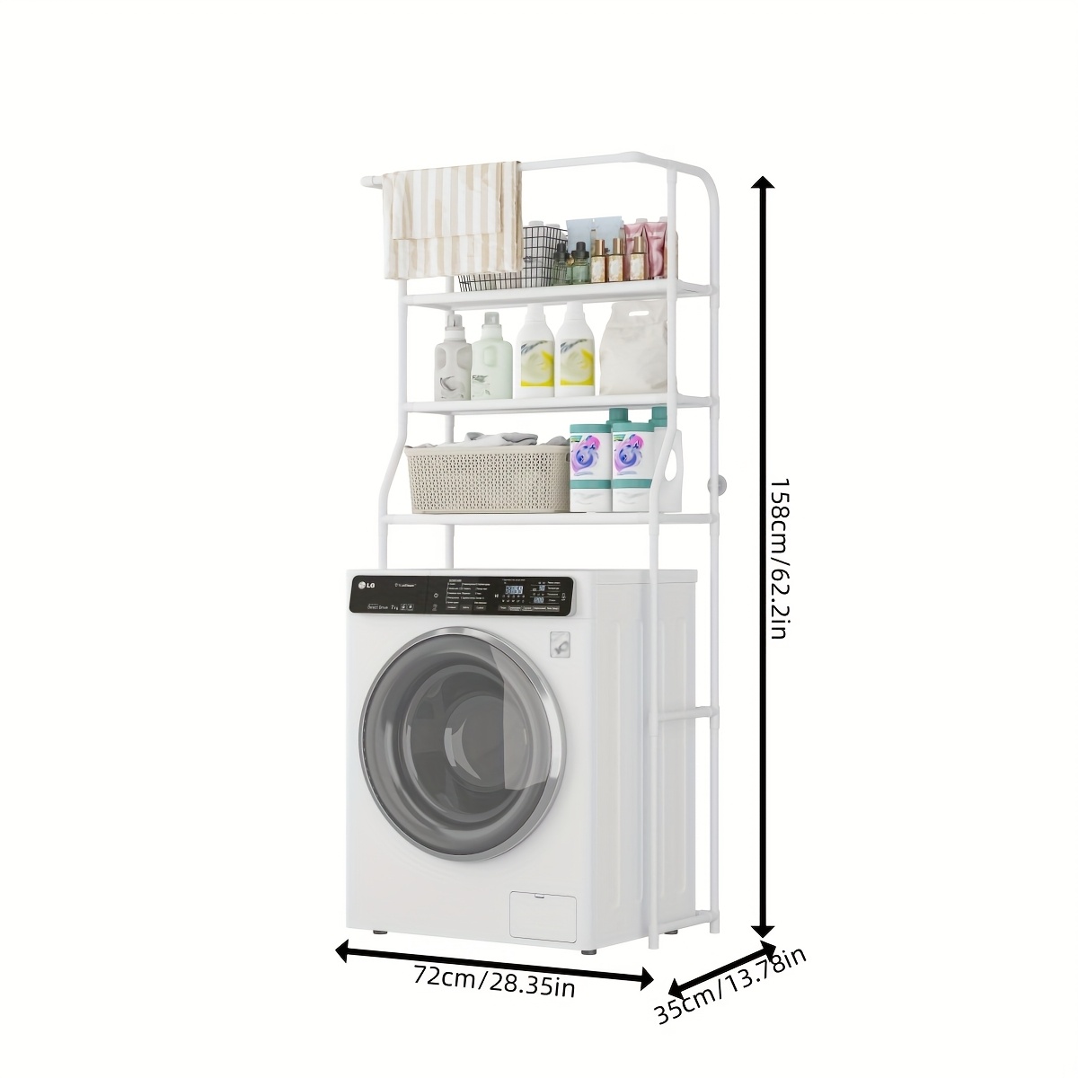 Uma prateleira de armazenamento sem furos para banheiros, projetada para máquinas de lavar. Este organizador multicamadas é feito de metal e plástico resistentes, oferecendo ampla capacidade e economizando espaço. Ideal para lavanderias, apresenta um design moderno e elegante