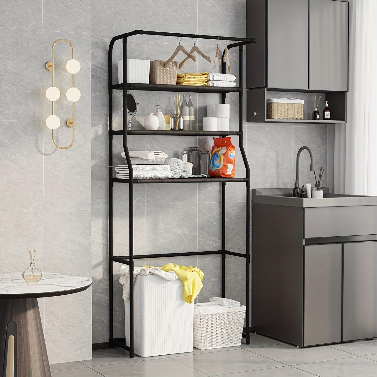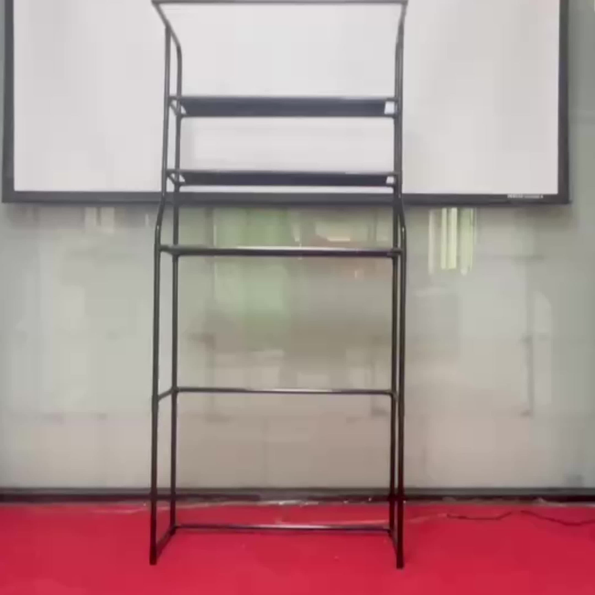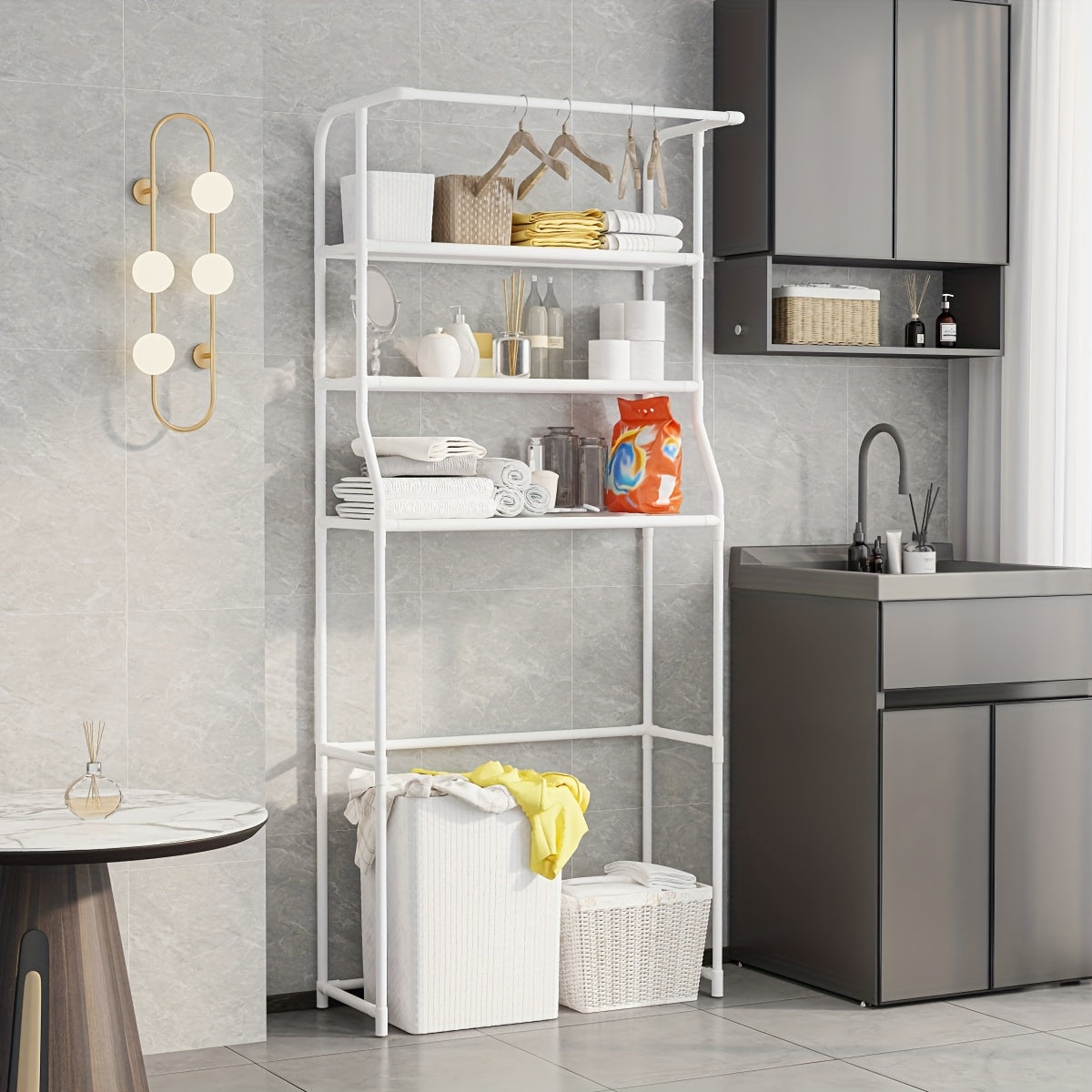 Uma prateleira de armazenamento sem furos para banheiros, projetada para máquinas de lavar. Este organizador multicamadas é feito de metal e plástico resistentes, oferecendo ampla capacidade e economizando espaço. Ideal para lavanderias, apresenta um design moderno e elegante